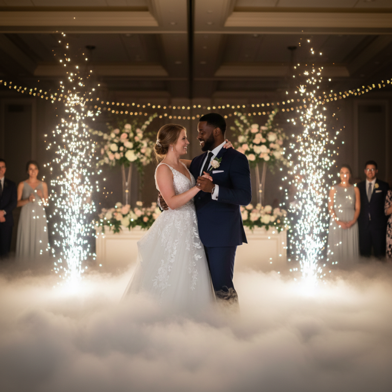 Cold spark fountains provide controlled, indoor-friendly effects when operated with proper clearance. Dry ice fog stays low to the floor and dissipates quickly.